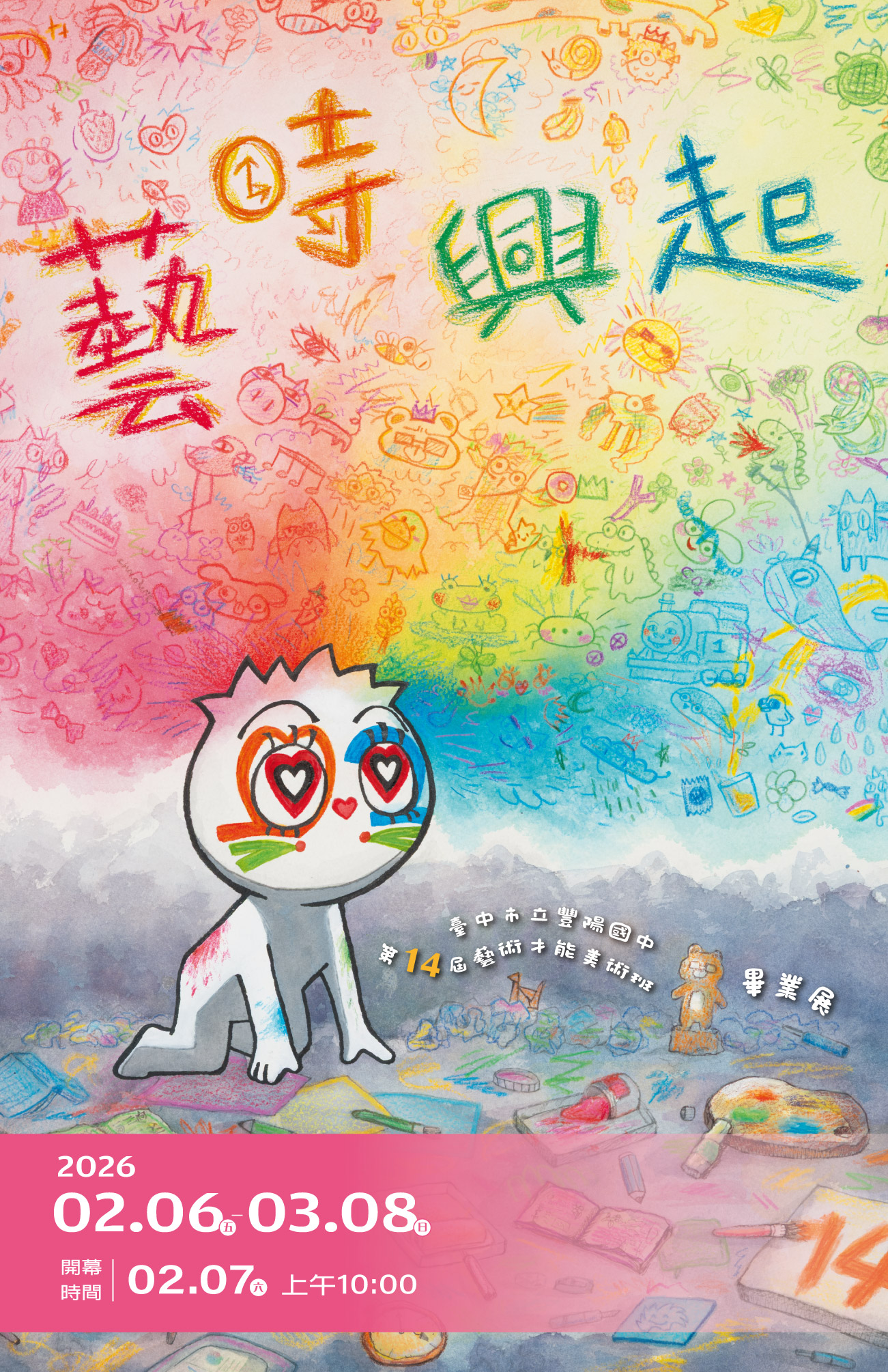 靈感常在不可預期的瞬間燃起,或源自走往福利社的閒聊、教室玻璃窗上映出的光影、廁所中的沉思,或睡前突如其來的一道靈光,皆化為創作的火花。「藝時興起」匯集了豐陽國中美術班第14屆18位學生、90餘件作品的心血。誠摯邀請您走入少年視界,感受真摯眼光與自由想像,在稍縱即逝的靈光中,看見藝術最初、最純粹的悸動。