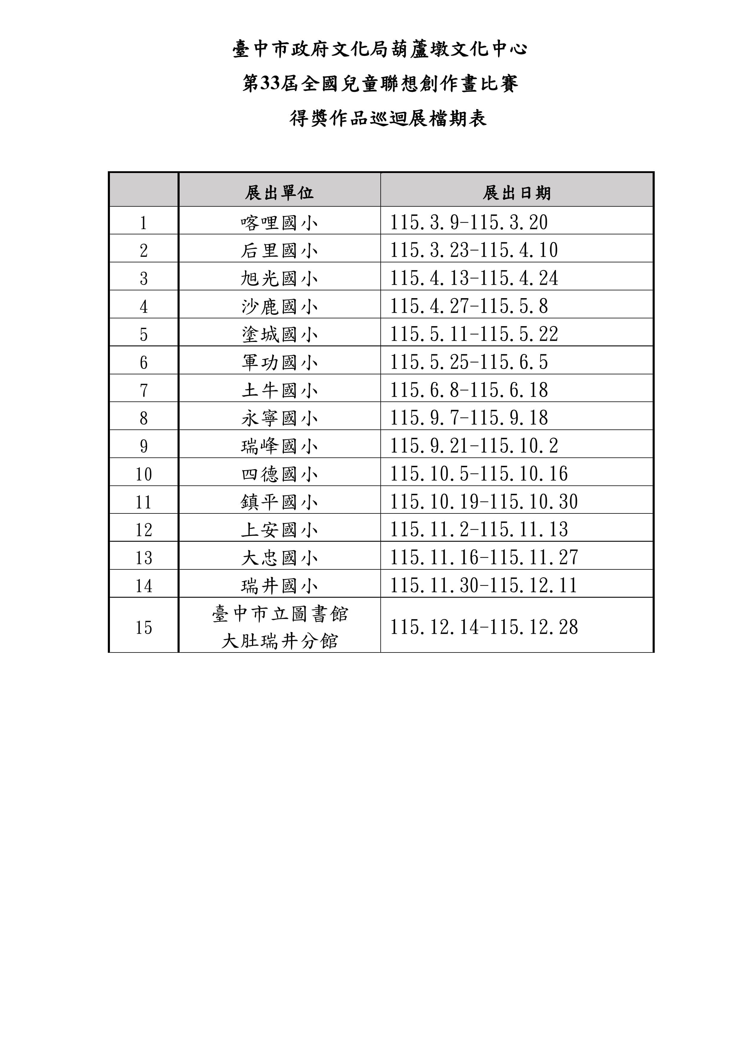 | 活動名稱 | 第33屆全國兒童聯想創作畫比賽得獎作品115年巡迴展(7)-石岡區 土牛國小 | |