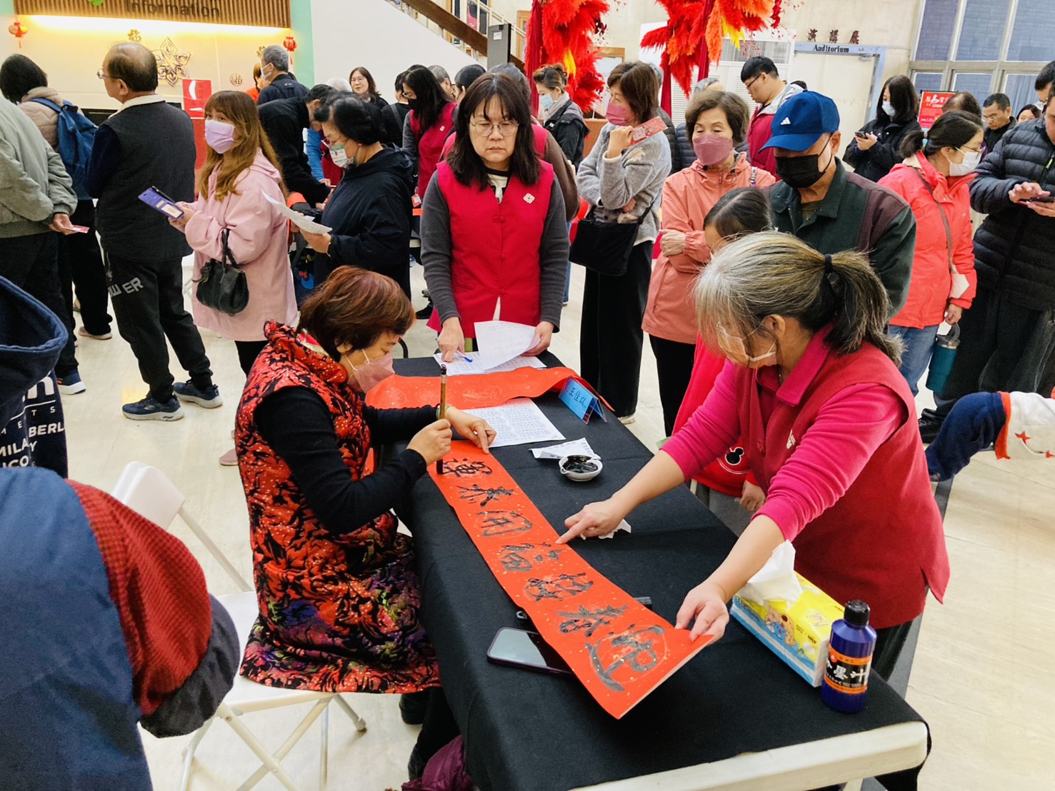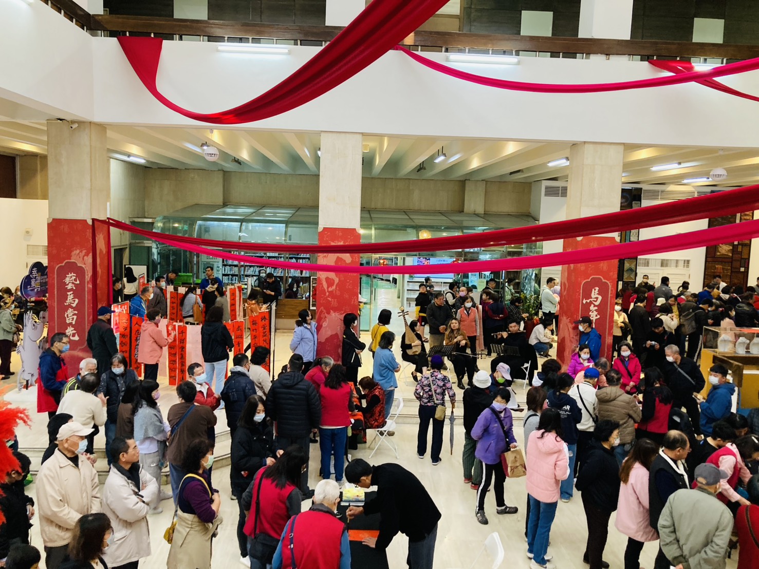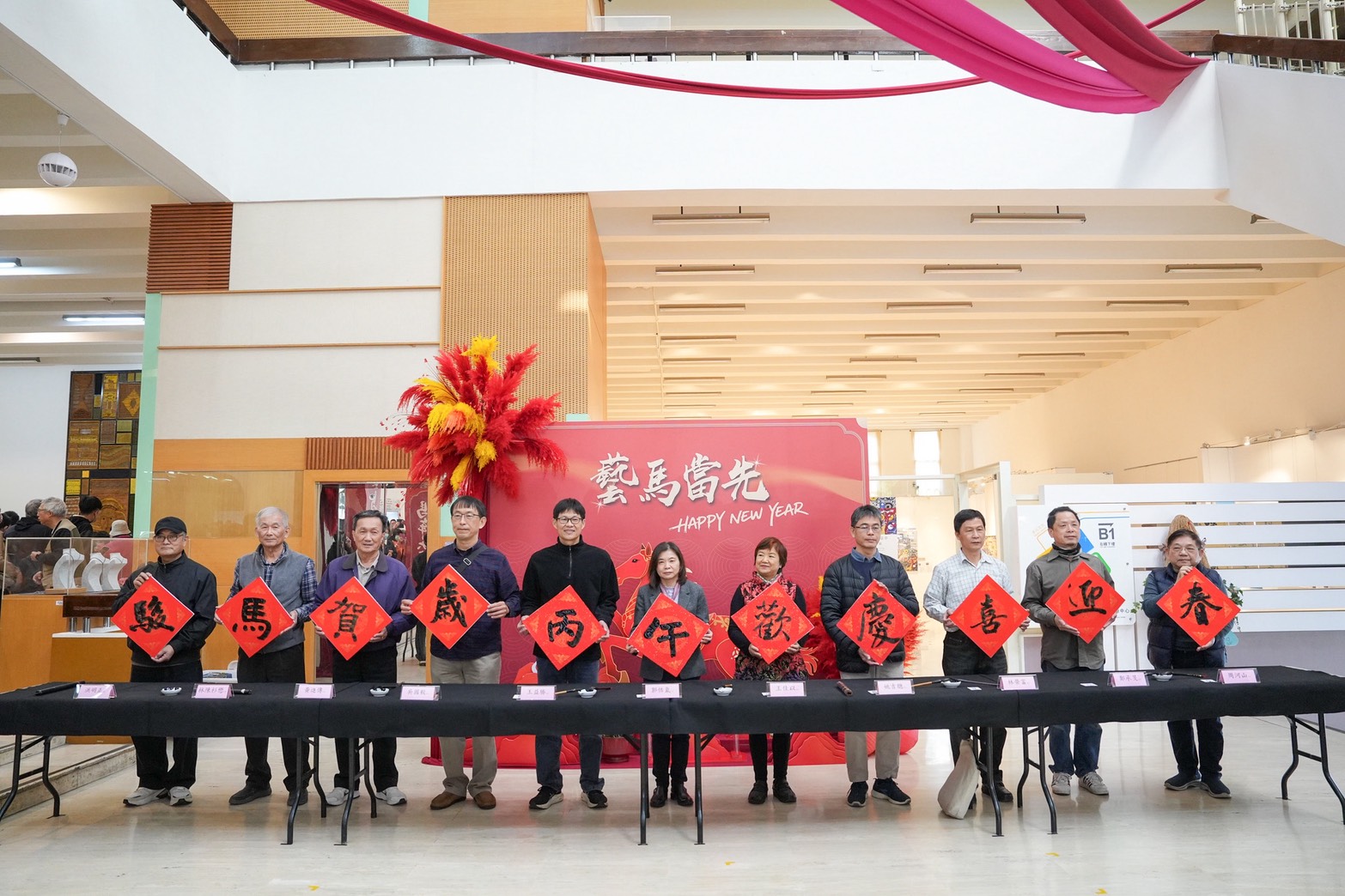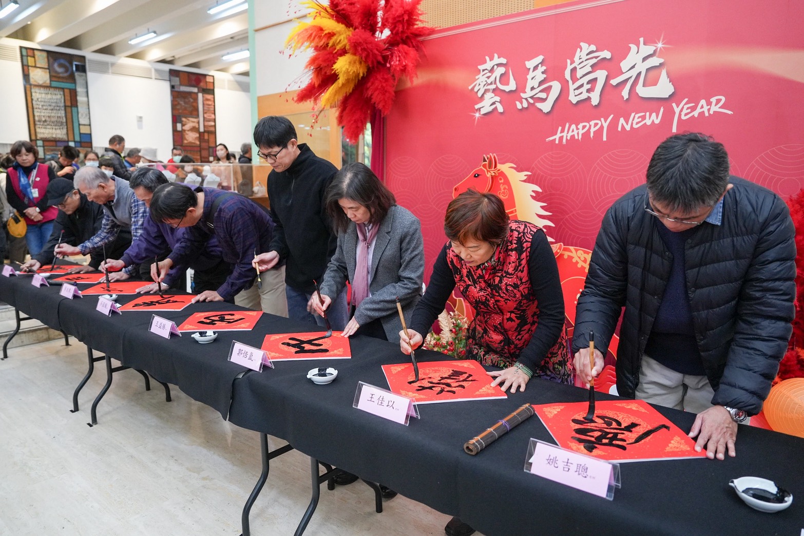 To celebrate the Year of the Horse, the Huludun Cultural Center hosted the "2026 Horse-Themed New Year Celebration: Calligraphy by Renowned Artists" event on Saturday, January 24th, at 9:30 AM in the lobby. In collaboration with the Taichung City Calligraphy Association, the event featured ten distinguished calligraphers—Hong Mingzheng, Wang Jiayi, Wang Yisheng, Yao Jicong, Huang Jinchuan, Wu Guoyi, Lin Rongfu, Zheng Chengmin, Zhou Heshan, and Lin Chenshanmao—who created calligraphy works on-site. A total of 200 handwritten couplets, including seven-character couplets and calligraphy square pieces, were distributed, along with Q-version Year of the Horse red envelopes. The event attracted enthusiastic public participation. The event commenced with Director Guo of the Center delivering opening remarks on behalf of the Bureau Director, followed by a ceremonial first stroke alongside the ten masters, inscribing the auspicious blessing: “Gallant Horses Herald the New Year, Celebrating the Year of the Horse with Joyful Spring Greetings,” to convey good wishes. In addition to witnessing the master calligraphers skillfully wield their brushes and appreciating the beauty of their work, the audience was accompanied by music from the Chung Sheng Chinese Orchestra, creating a lively and festive atmosphere. The lobby featured an installation titled “Leading the Way with Artistic Horses to Welcome the New Year,” immersing visitors in the festive spirit as the public gathered to welcome a joyful and peaceful year together.