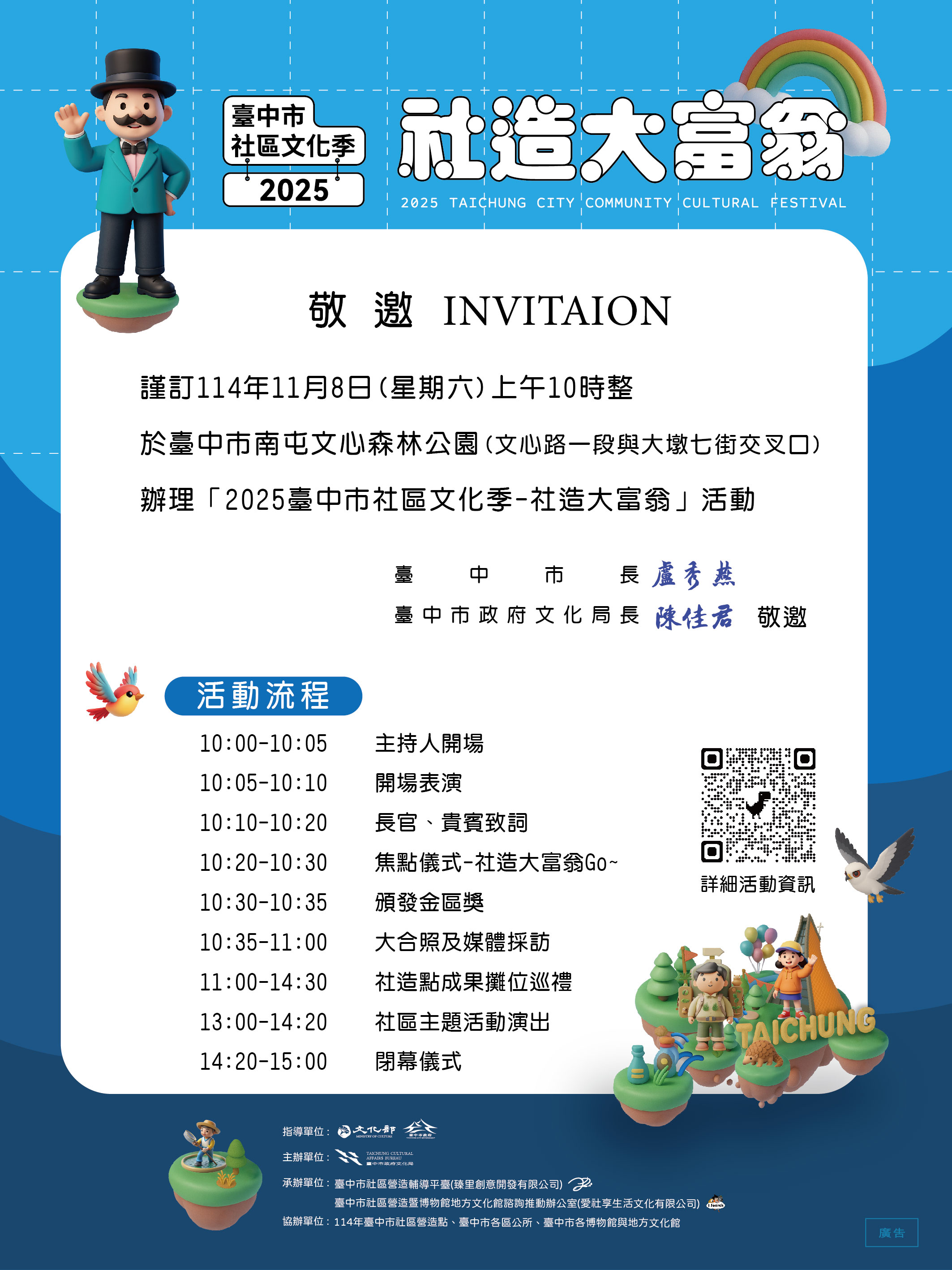 為展現臺中市社區營造成果,串聯114年度社造點、各區公所、社區大學等,共同呈現社區的主題特色,於本市文心森林公園南側溜冰場(文心路一段與大墩七街交叉口)11月8日上午10時至15時舉行,歡迎踴躍參加。